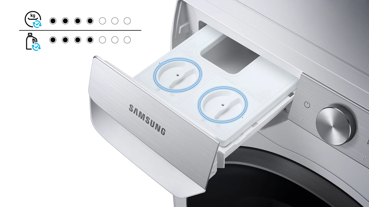 Được trang bị ngăn nước giặt xả thông minh AI Dispenser, máy giặt tự động phân bổ lượng nước giặt, nước xả chính xác theo khối lượng áo quần cho hiệu quả giặt sạch tối ưu, tránh lãng phí.