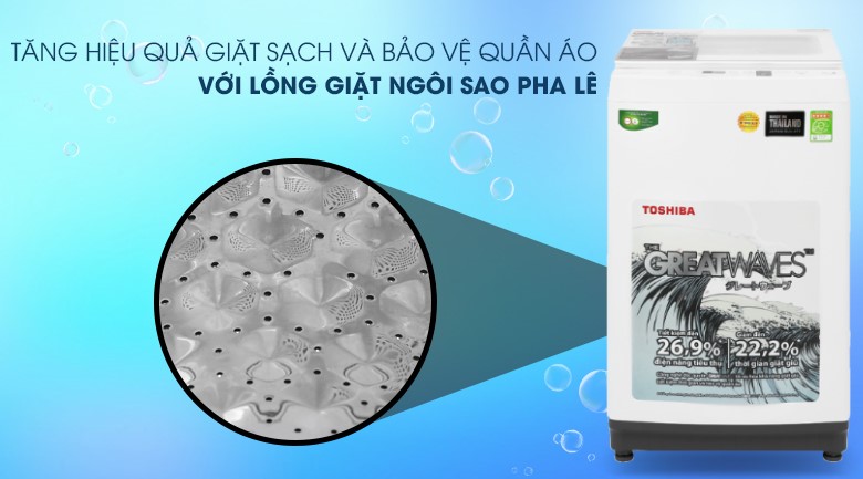 Lồng giặt ngôi sao pha lê của chiếc máy giặt Toshiba này được thiết kế các gờ nổi cong mềm mại có hình dạng giống như ngôi sao pha lê và xen kẽ những lỗ nhỏ khác xung quanh, tựa như chiếc ván giặt. Nhờ vậy, quần áo của bạn được làm sạch một cách nhanh chóng mà vẫn không gây hư hại sợi vải.