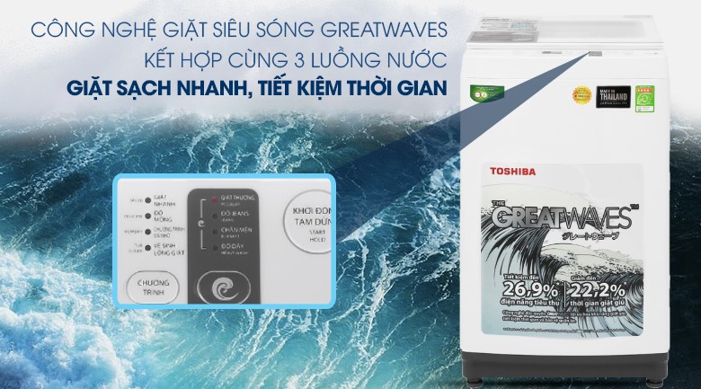 Công nghệ giặt Greatwaves kết hợp 3 luồng nước, cho việc giặt quần áo sạch nhanh hơn