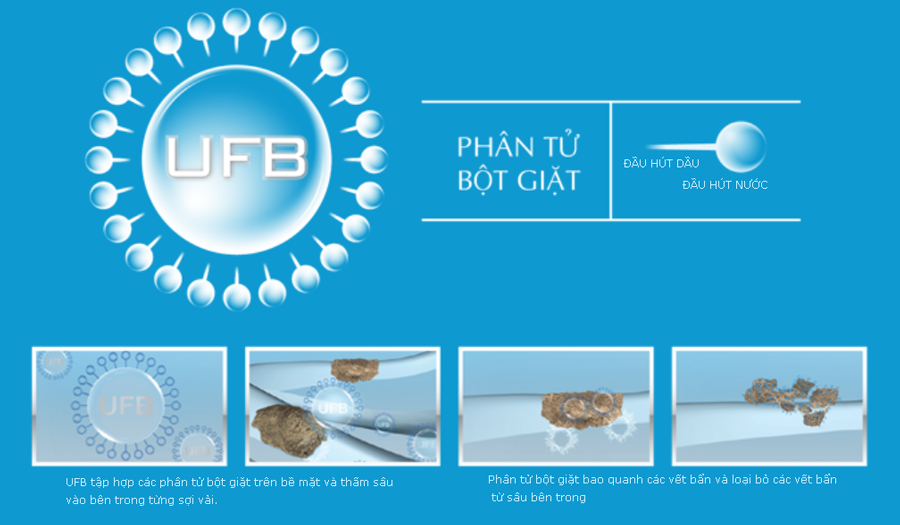 Công nghệ siêu bọt khí Nano (UFB) trên máy giặt tạo ra các bọt khí có kích thước Nano siêu nhỏ, nhỏ hơn 200 lần so với khe hở giữa các sợi vải, dễ dàng thấm sâu, loại bỏ các chất bẩn một cách hiệu quả mà không cần sử dụng quá nhiều bột giặt.