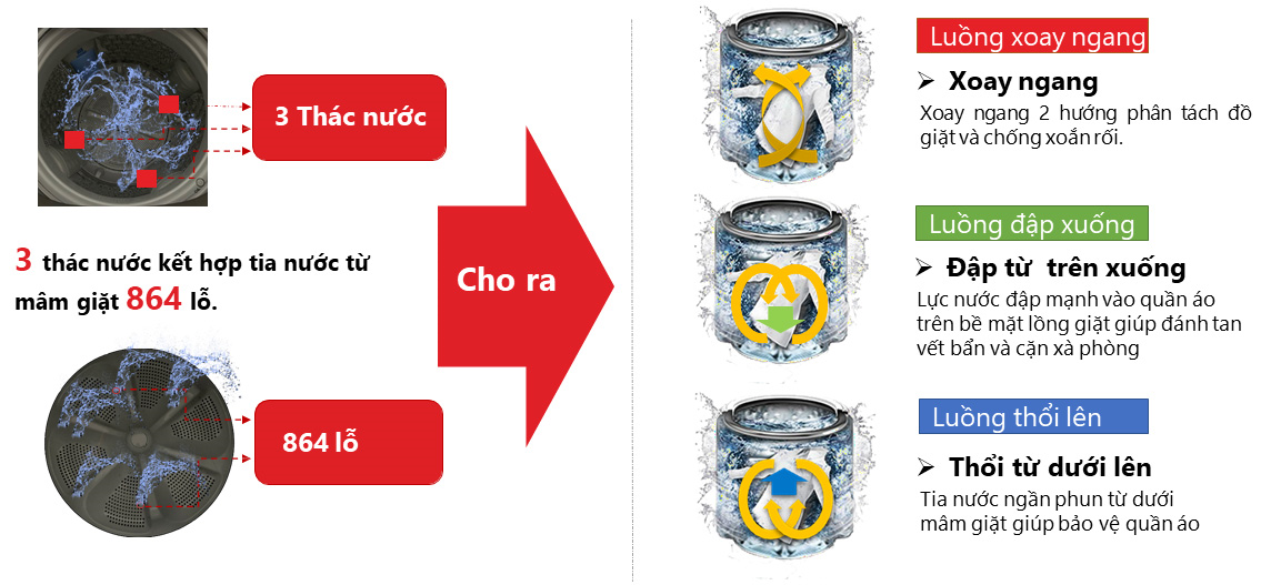 3 thác nước kết hợp tia nước từ mâm giặt 864 lỗ tạo thành 3 luồng nước di chuyển theo 3 hướng khác nhau, giúp dễ dàng đánh bật các vết bẩn cứng đầu, hạn chế cặn xà phòng, bên cạnh đó còn chống rối và sờn quần áo.