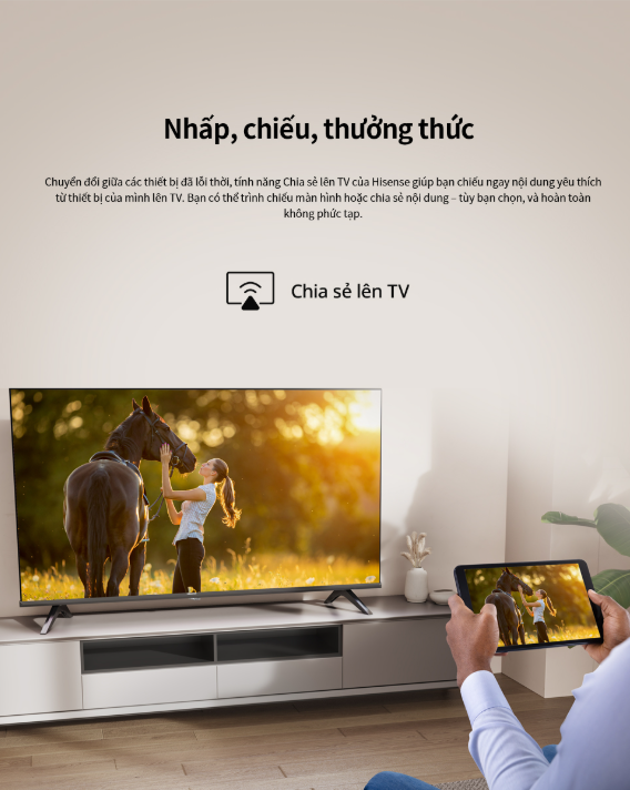 Tivi hỗ trợ Share to TV (Screen Share / Screen Mirroring) cho phép truyền hình ảnh, video hoặc nội dung từ điện thoại và máy tính bảng lên màn hình TV thông qua kết nối Wi-Fi.