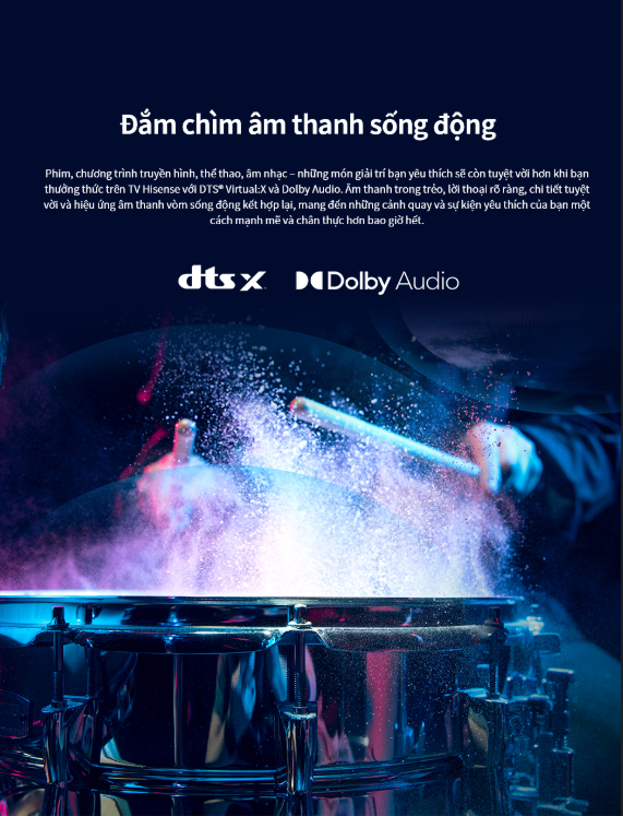 Ngoài ra, sản phẩm còn được trang bị nhiều công nghệ xử lý hình ảnh và âm thanh như Pixel Tuning, Depth Enhancer, Precision Colour và DTS Virtual:X, giúp nâng cao trải nghiệm khi xem phim, chương trình truyền hình hoặc thể thao.